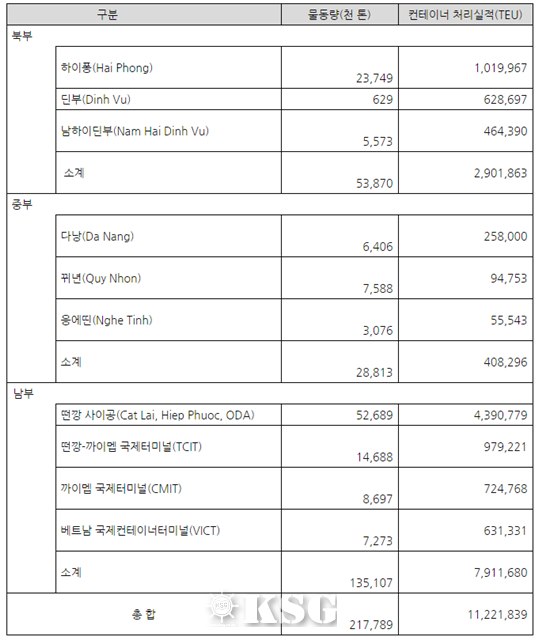 북부지역에는 하이퐁시와 꽝닝성이 포함돼 있다. 하이퐁시의 경우 북부 주요 12개 항만이 위치해 있으며, 컨테이너 처리능력(CAPA)은 450만TEU 수준이다. 남동부지역은 호치민시와 까이멥-붕따우 지역이 포함돼 있다. 호찌민시에는 9개 컨테이너 항구가, 까이멥-뿡따우 지역엔 7개 항구가 있다. 이 두 지역의 컨테이너 처리실적은 베트남 전체 컨테이너 처리량 대비 70%를 차지할 정도로 큰 비중을 차지하고 있다.