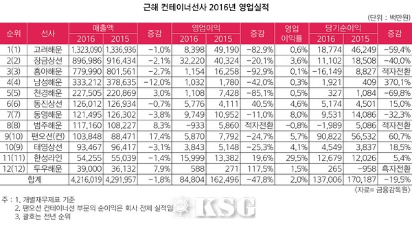아시아역내항로 부진을 배경으로 지난해 근해선사들의 실적이 뒷걸음질 쳤다. 금융감독원에 따르면 지난해 근해 컨테이너항로를 취항하는 국적선사 12곳의 전체 매출액은 4조2160억원을 기록했다. 2015년의 4조2920억원에 견줘 2% 감소한 수치다. 영업이익은 848억원으로 반 토막났으며 당기순이익은 두 자릿수 감소한 1370억원에 머물렀다. 2013년 이후 3년만에 외형과 내실 모두 마이너스성장을 신고했다.