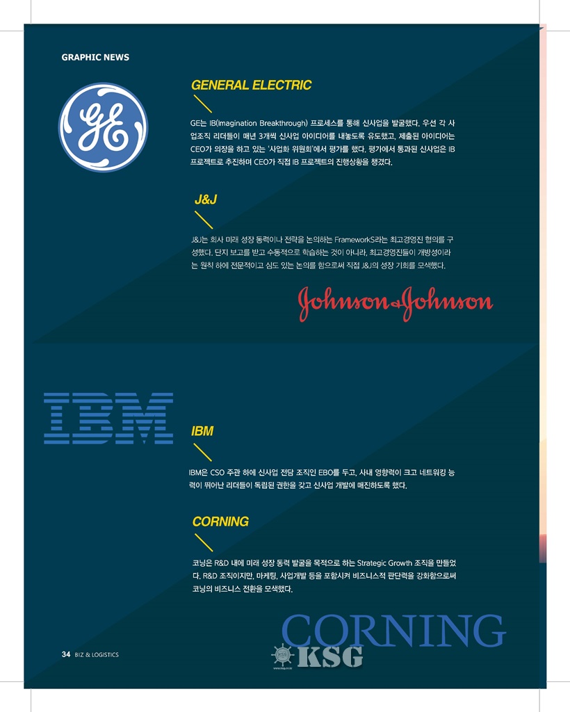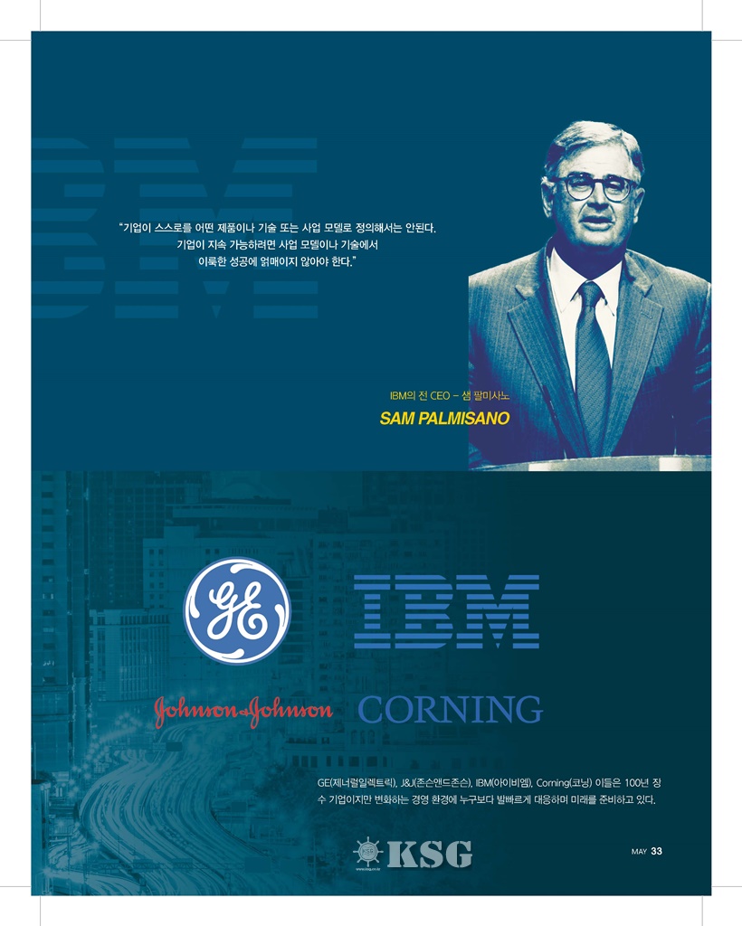 GE(제너럴일렉트릭), J&J(존슨앤드존슨), IBM(아이비엠), Corning(코닝) 이들은 100년 장수 기업이지만 변화하는 경영 환경에 누구보다 발빠르게 대응하며 미래를 준비하고 있다.