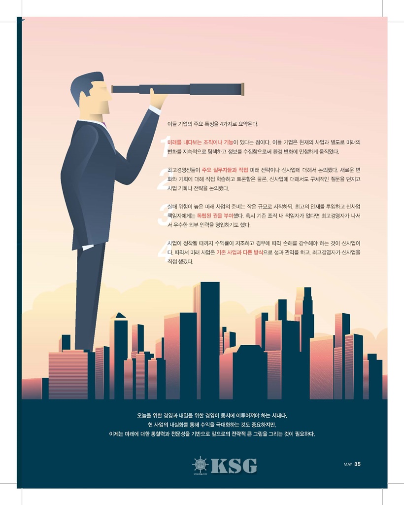 오늘을 위한 경영과 내일을 위한 경영이 동시에 이루어져야 하는 시대다. 현 사업의 내실화를 통해 수익을 극대화하는 것도 중요하지만, 이제는 미래에 대한 통찰력과 전문성을 기반으로 앞으로의 전략적 큰 그림을 그리는 것이 필요하다.