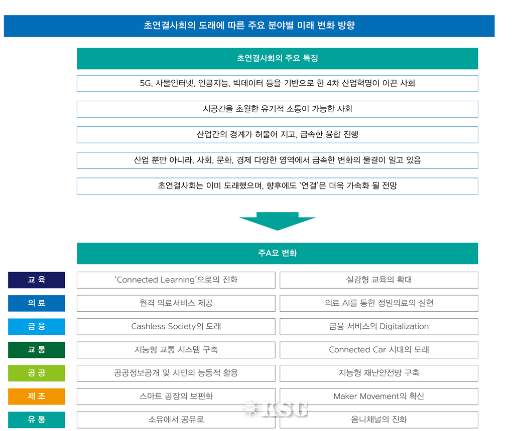 초연결사회는 교육, 의료, 금융, 교통, 공공, 제조, 유통과 같은 7가지 영역에 걸쳐 큰 변화를 불러올 것이다. 교육 산업의 경우, 사물과 사람이 모두 연결되는 ‘Connected Learning’로의 진화가 예상되고 있다. 학생과 교사간 또는 학생간 연결에 의한 상호작용이 강조되며, 개개인의 학생들은 사물인터넷, 인공지능 기술 등을 바탕으로 최적화된 맞춤학습을 제공받을 수 있게 될 전망이다. 문제풀이를 도와주는 SNS, 빅데이터를 활용한 수준별 문제제공 및 오답관리 서비스가 증대되고 있다. 한편 흥미와 몰입을 최대화할 수 있는 증강현실, 가상현실 기반의 실감형 교육이 확산될 것으로 전망된다.