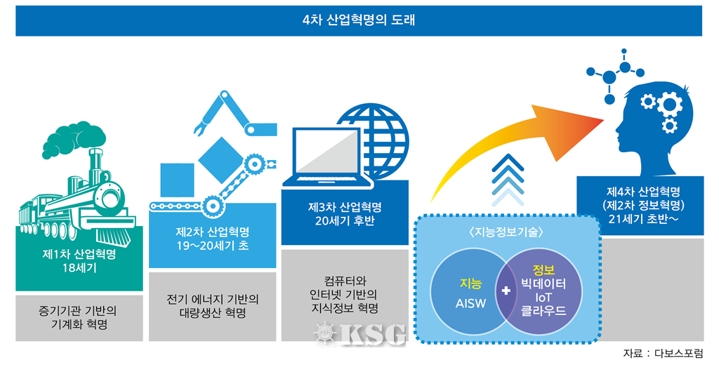 4차 산업혁명(Industry 4.0)이 시작됐다. 인류의 역사는 크게 4단계에 걸쳐 진화해 왔다. 기계화에 따른 1차 산업혁명, 전기 에너지에 기반한 2차 산업혁명, 컴퓨터와 인터넷에 기반한 3차 산업혁명이 있었다. 이어서 2000년대 들어 지능과 정보에 기반한 4차 산업혁명이 시작됐다. 인류는 이러한 혁명에 의해 생산성이 고도화 됐고, 그때마다 사회와 산업의 구조를 획기적으로 바꿔 놨다.