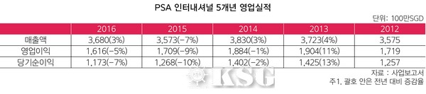 PSA의 이익률이 매년 뒷걸음질 치는 점도 걸림돌로 작용한다. 싱가포르 국영 터미널 운영사는 지난해 36억8000만싱가포르달러(SGD·한화 2조9816억원)의 매출액을 거뒀다. 전년 35억7000만SGD 대비 3% 증가한 수치다. 컨테이너 물동량이 6800만TEU로 전년 대비 5.5% 늘어난 덕분이다.