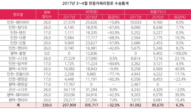 범영훼리의 인천-잉커우 노선은 85% 감소한 1725명, 진인해운의 인천-친황다오는 77% 줄어든 2258명을 기록, 감소율 기준으로 각각 두 번째와 세 번째에 이름을 올렸다.