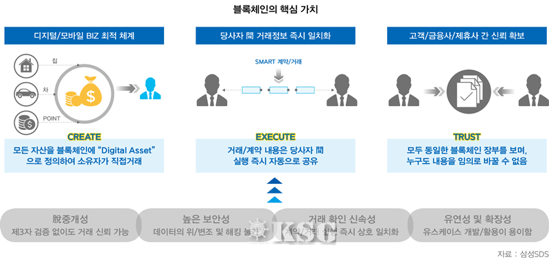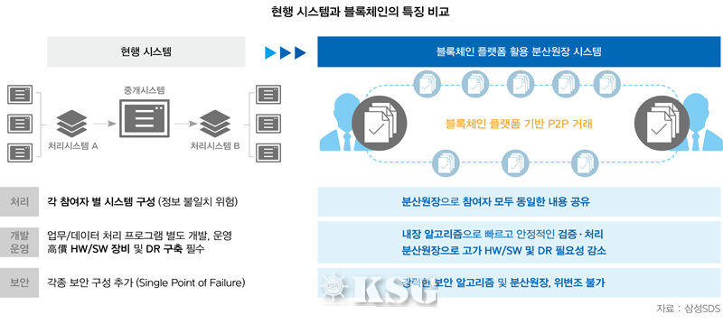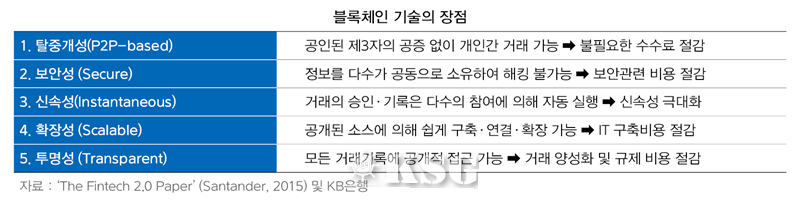 블록체인은 거래내역 정보를 ‘중앙 집중형’ 서버에 저장하지 않고 공동으로 검증·기록·보관하는 P2P(개인간) ‘분산형’ 거래 시스템이다. 가령 A기업이 물건을 수취하고 전자거래서명을 완료하면, 블록체인에 참여하고 있는 B와 C기업에도 동일한 데이터가 기록된다. 이 데이터는 서로간의 합의가 없으면 삭제할 수 없다. 즉 모든 거래 참여자의 거래내역을 공동으로 관리함으로써 거래를 대조할 수 있으며, 이에 따른 데이터 위조를 방지하며 보안비용을 절감할 수 있다.