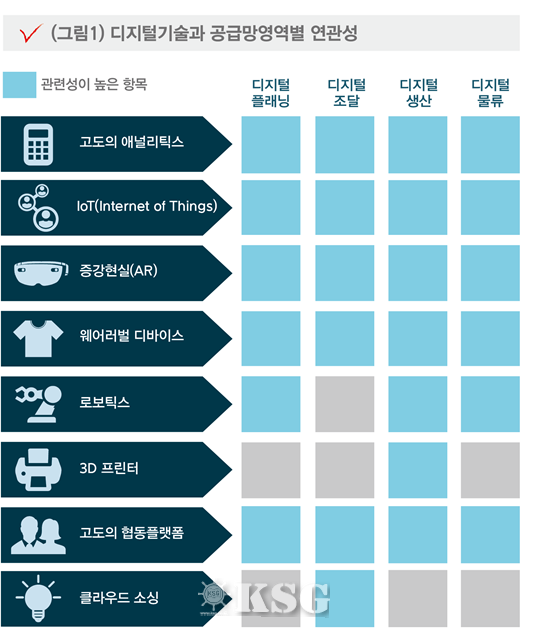 최근 들어서, SCM 분야에 (그림1)에서 예시한 바와 같은 빅데이터 기반의 고도의 애널리틱스, IoT나 AR, 웨어러블 디바이스, 로보틱스, 3D 프린팅, 협동플랫폼, 클라우드 소싱 등으로 대표되는 디지털 기술들의 활용이 점차 확대되면서 SCM 전 분야에 걸친 고도화가 비약적으로 진행되기 시작하고 있다.