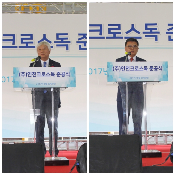(사진 위 왼쪽)는 인사말을 통해 "인천신항 최초의 물류센터인 인천크로스독은 국제물류의 전초기지로서 역할을 담당하며 인천신항 물류의 새로운 도약을 기약하는 희망의 발판이 되리라 확신하다"고 말했다. 그는 이어 "종합물류센터 시설을 기반으로 고부가가치 화물창출형 물류센터 구축에 힘써 인천신항이 지향하는 대중국 대동북아 국제물류배송센터 역할과 환적화물 유치 활성화에 최선을 다하겠다"고 덧붙였다.