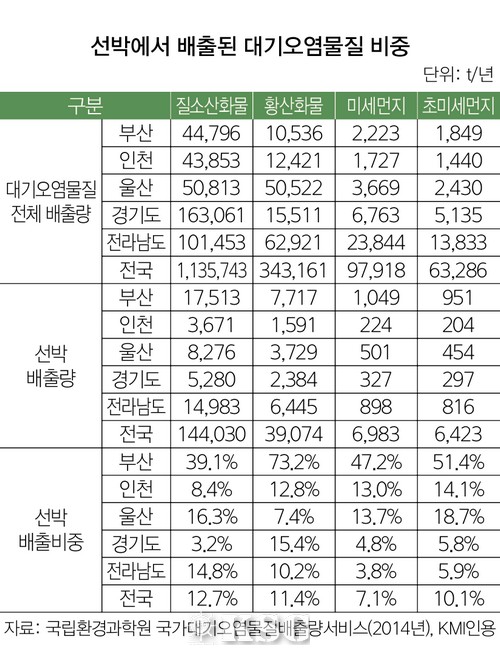 KMI는 전국 대기오염물질 중 선박에서 배출된 황산화물이 전체 배출량의 11.4%, 초미세먼지는 전체 배출량의 10.1%를 차지하고 있다고 평가했다. 보고서에 따르면 주요 항만인 부산항 인천항 울산항 평택·당진항 광양항이 위치한 지역에서의 선박 대기오염물질 배출 비중은 전국 평균을 웃돌고 있다.