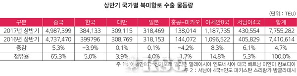 중국, 일본, 대만 등 주요국들의 상반기 물동량은 상승세를 보인 반면, 한국과 홍콩은 마이너스 실적을 기록했다. 1~6월 중국발 북미 수출물량은 498만7399TEU를 기록했다. 한국발 1~6월 누적수출물량은 38만4133TEU로 전년 동기 대비 3.9% 줄었다.
