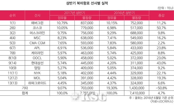 2위에는 중국 코스코가 덴마크 머스크라인을 제치고 올라섰다. 지난해 6위에 머물던 코스코는 차이나쉬핑을 흡수한 이후 몸집을 크게 불렸다. 코스코는 6월 한 달 간 7.6% 증가한 14만1천TEU를 처리해 4개월 연속 증가세를 기록했다. 상반기에 처리한 물동량은 전년 동기 대비 50.7%나 증가한 77만9천TEU로 코스코의 시장점유율은 10.05%다. 1위 에버그린과는 0.74포인트의 격차만을 남겨두고 있는 데다 최근 홍콩선사 OOCL 인수를 결정하면서 시장점유율은 15.95%까지 늘어나 곧 북미항로 1위 선사로 올라서게 된다.
