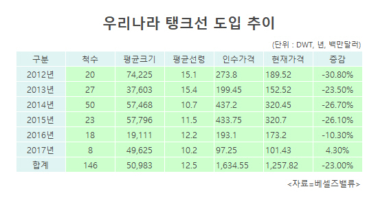 선가는 도입 당시와 비교해 큰 폭으로 떨어졌다. 베셀즈밸류는 탱크선 146척의 인수가격은 16억3455만달러였으며 현재 시세는 23% 하락한 12억5782만달러라고 집계했다.