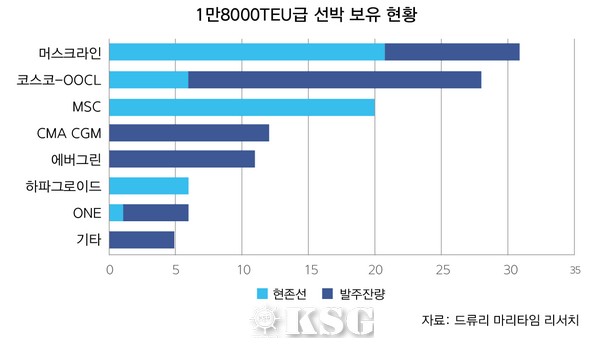 하지만 CMA CGM의 발주잔량은 14만TEU로 MSC를 따라잡기에는 역부족인 반면, 코스코의 발주잔량은 52만TEU에 달한다. 코스코가 OOCL과 합쳐지면 선복량은 더욱 늘어나 큰 격차를 보이게 된다.