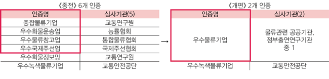 여러 기관에서 관리했던 6개의 인증제는 재작년 새로운 변화를 맞았다. 6개 인증을 우수물류기업인증, 우수녹색물류기업으로 통·폐합한 것. 이듬해 국토교통부와 해양수산부는 심사대행기관을 교통연구원으로 이관했다. 심사 규정도 강화했다. 인증 요건은 100점 중 70점 이상, 세부심사 항목별로 20% 이상을 받도록 했다. 재심사 기간도 2년에서 3년으로 늘었다. 신규 인증은 300만원, 정기심사(재심사)는 150만원의 수수료를 납부, 기존과 동일하다.