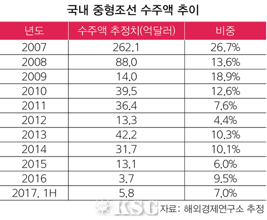 수출입은행에 따르면 한진중공업 성동조선해양 대한조선 대선조선 STX조선해양 연수중공업 등이 포진해 있는 국내 중견조선업계의 상반기 수주액은 약 5억8000만달러(한화 약 6610억원)로 전년 대비 257% 폭증했다. 지난 한 해 실적인 3억7800만달러(약 4300억원)를 웃도는 수치다.