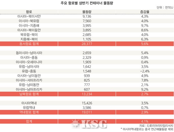 물동량은 유일하게 마이너스 성장을 기록한 유럽-중동항로를 제외한 모든 항로에서 지난해 상반기보다 성장세를 보였다. 물동량 성장세가 두드러진 항로는 아시아역내, 아시아-북미서안, 아시아-지중해, 아시아-북미동안, 아시아-북유럽이 대표적이다. 특히 아시아역내항로는 지난해 상반기 대비 3.5% 증가한 1542만6000TEU를 처리해 가장 많은 물동량을 기록했다.