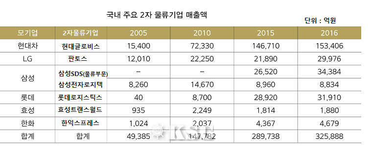 2자물류기업이 물류업계에서 미움을 받는 이유는 모기업 물량을 기반으로 ‘갑질’을 자행한 탓이다. 국내 주요 대기업은 물류자회사(2자물류)를 하나씩 두고 있다. 삼성은 삼성SDS, 현대는 현대글로비스, LG는 판토스, 한화는 한익스프레스, 롯데는 롯데로지스틱스를 두고 있다. 대기업 물류자회사는 모기업의 물량을 기반으로 단기간에 급속한 성장을 일궜다. 현대글로비스는 2001년 정몽구 현대차그룹 회장과 정의선 부회장이 각각 10억원, 15억원을 출자해 만들었다. 이 회사의 지난해 매출액은 15조3400억원으로 집계됐다. 롯데로지스틱스의 2005년 매출액은 40억원 규모에서 지난해 3조1240억원으로 성장했다. 직원 588명의 인당 매출액은 53억1300만원으로 전체 계열사 중 가장 높다.