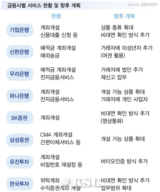 한편 금융산업은 비대면 서비스를 늘리기 위해 열중 하고 있다. 영상, 메일, 문자, 톡 등의 비대면 채널을 이용한 온라인 본인인증 서비스와 실시간 통화내용 분석으로 인공지능(AI) 엔진을 학습시켜 상담 업무 지원 및 챗봇(Chatbot)을 이용한 무인상담까지 발전시키고 있다. 향후 시중은행 및 증권사에서는 현재 비대면 방식의 계좌개설과 더불어 영상 통화 및 바이오 인증과 같은 비대면 실명확인 방식을 추가할 것으로 보인다.