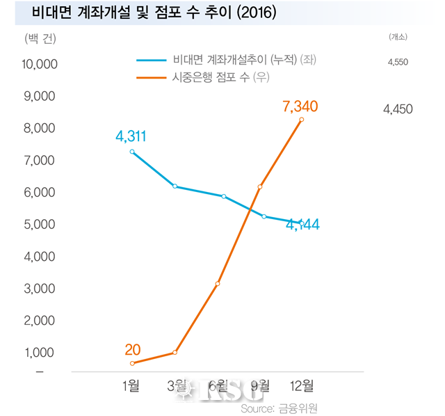 K뱅크는 2017년 4월 3일 출범해 한국의 첫 인터넷전문은행이 됐고, 이어 7월 27일 카카오뱅크가 출범했다. K뱅크는 출범 100일만에 수신 6,500억원, 여신 6,100억원을 기록하며 이미 2017년 목표치인 수신 5,000억원, 여신 4,000억원을 넘어섰다. 특히 카카오뱅크는 카카오라는 강력한 플랫폼을 무기로 출범 5일 만에 개설 계좌 100만개를 돌파했다. 예·적금은 3,440억원, 대출은 3,230억원을 넘어섰다. 애플리케이션(앱) 다운로드는 178만건에 이른다. 계좌 개설 고객 중 67%인 67만명이 체크카드 신청을 완료했다. 카카오뱅크는 시중은행 전체가 지난해 1년 동안 기록한 비대면 계좌 개설 건수인 15만 5,000건을 출범 첫날 18만 7,000계좌로 넘어섰다.