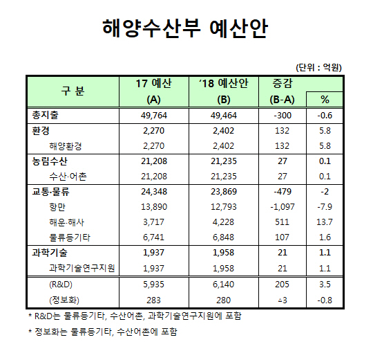 해양수산부는 2018년도 예산(기금 포함)을 4조9464억원으로 편성했다고 30일 밝혔다.