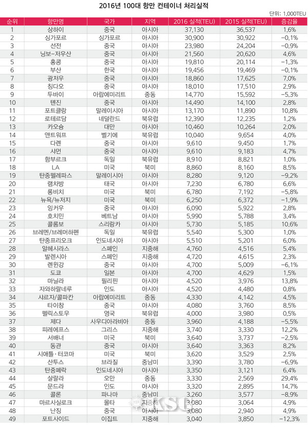 2위는 싱가포르항이 차지했다. 2014년까지 성장세를 이어오던 싱가포르항은 지난해 3090만4000TEU를 처리해 2년 연속 물동량이 감소하고 있다. 싱가포르해사청(MPA)은 “동남아시아 메가 환적허브를 꿈꾸는 싱가포르항은 해운항만산업의 침체에 직격탄을 맞았다”며 “선사들의 얼라이언스 합종연횡과 인수합병, 선복과잉에 따른 낮은 해상운임의 영향에 싱가포르항도 영향을 받고 있다”고 평가했다.