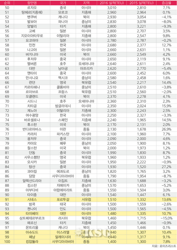 이스라엘의 아슈도드항은 98위에 이름을 올렸다. 아슈도드항은 지난해 144만3000TEU를 기록해 전년 대비 10.4% 증가했다. 아슈도드항은 국적선사 짐라인과 일부 얼라이언스 선사들이 매주 아슈도드항을 기항하고 있어 물동량 성장세가 상당하다.