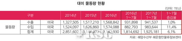 해양수산부 해운항만물류정보센터에 따르면 1~7월 한국발 미국행 물동량은 192만5천TEU를 기록해 전년 동기 대비 6% 증가했지만 수출물동량만 놓고 보면 전년 동기 대비 단 1% 증가에 그쳤다.
