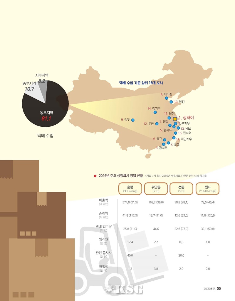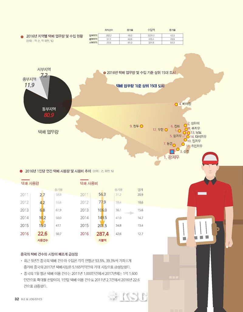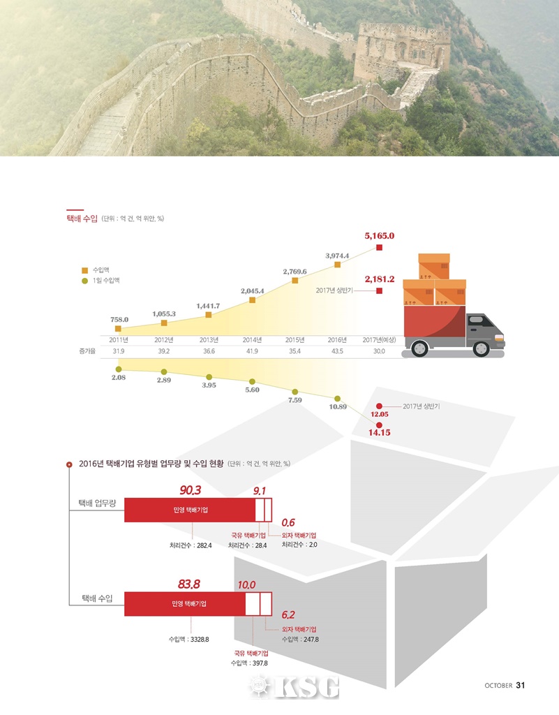 최근 5년간 중국의 택배 건수와 수입은 각각 연평균 53.5%, 39.3%씩 가파르게 증가해 중국의 2017년 택배시장은 5,165억위안의 거대 시장으로 급성장했다.