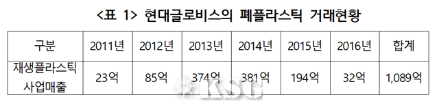 현대글로비스의 재생플라스틱 거래규모는 2011년 23억원에서 6년간 총 매출액은 1089억원 규모로 집계된다.