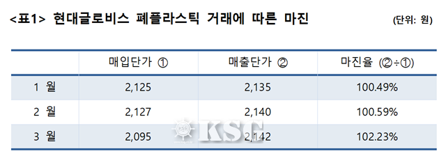 심상정 의원실 측은 “일반 상거래에는 채권 미회수에 따른 위험 및 재고 부담에 따른 위험 등이 있고 아울러 판매관리비 부담도 우려되지만, 적정 마진이 제공되지 않는 한 해당거래를 계속할 유인이 없음에도 현대글로비스는 6년간 이 사업을 지속했다”며 “의원실에서 현대글로비스가 제출한 2015년 1~3월 거래자료를 분석한 결과, 해당 거래에서 현대글로비스는 불과 0.5%의 마진을 남겼다”고 설명했다.