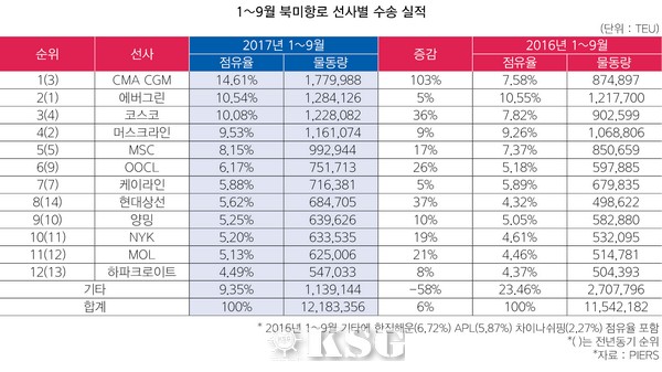 선사별 수송실적에서는 1, 2위 선사가 3, 4위 선사들에 역전당하며 순위가 모두 뒤바뀌었다. 프랑스선사 CMA CGM은 몇 년 간 독주를 계속해왔던 대만 에버그린을 꺾고 1위를 차지했다. CMA CGM은 1~9월 177만9988TEU를 처리하며 전년동기대비 103%나 급증한 실적을 거뒀다. 지난해 4위를 기록했던 CMA CGM은 싱가포르 선사 APL 인수한 이후 실적이 합쳐지면서 순위가 세 계단이나 뛰어올라 선두를 꿰찼다. 북미항로에서 6%대의 점유율을 확보하고 있던 APL 인수로 CMA CGM의 점유율은 14.6%로 대폭 늘어나 경쟁 선사들과의 격차를 크게 벌렸다.