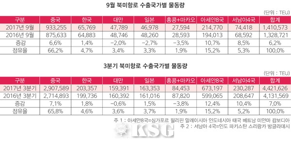 북미항로에서 가장 높은 성장률을 달리고 있는 중국은 3개월 연속 물동량 성장세를 보였다. 중국은 9월 전년동월대비 6.6% 증가한 93만3255TEU를 기록했다. 1위 수출품목인 가구가 10.9% 증가하며 7개월 연속 증가세를 기록했고 섬유 제품이 6.2% 늘어나 2개월 연속 증가했다. 3위 수출품목인 일반 전기기기도 전년동월대비 7% 증가해 상위 품목 증가가 전체 실적 견인으로 이어졌다.