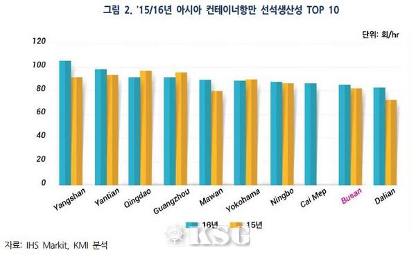 KMI는 부산항이 경쟁항만 대비 선석생산성이 낮은 건 선박 하역작업에 투입되는 STS크레인 대수가 상대적으로 적기 때문이라고 지적했다. 세계 주요 항만의 선석당 STS크레인 대수는 평균 4.0대 가량이지만 부산항은 3.3대에 불과해 생산성 향상에 한계가 있다. KMI는 실제 부산신항이 개장한 2006년 이후 안벽크레인에 대한 추가 투입은 거의 이뤄지지 않고 있다고 평가했다.