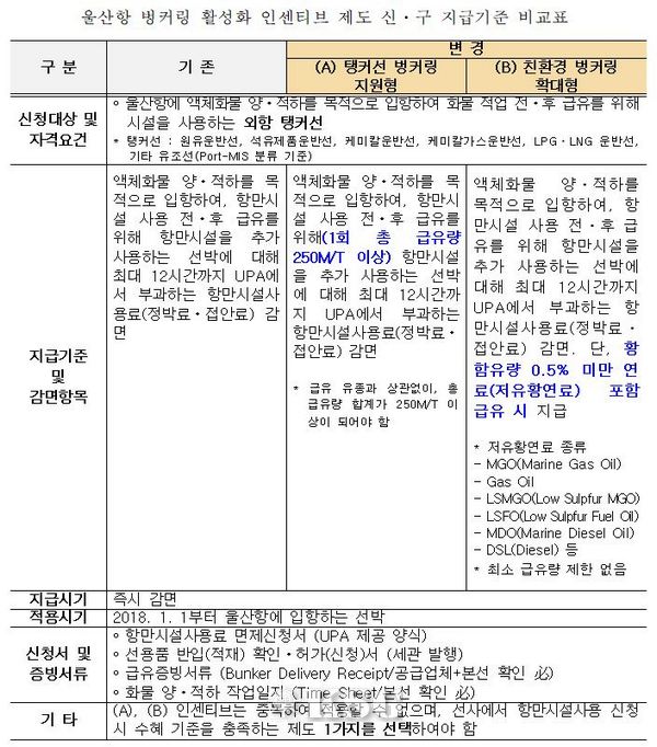 울산항만공사(UPA)가 울산항의 선박급유(벙커링) 시장 활성화를 위해 시행하고 있는 인센티브 제도에 대해 내년부터 수혜 기준을 변경한다고 27일 밝혔다.