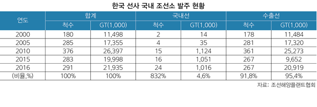 정 부장은 해운·조선업의 발전을 위해 산업간 공조가 절대적으로 필요하다고 강조했다. 지난해 국내 조선소 건조량 291척(2193만GT·선박의 총 무게) 중 국내선은 24척(102만GT)에 불과하다. 세계 1위를 자랑하고 있는 한국 조선시장이지만 정작 국내 해운사에 선박을 건조해 인도한 비중은 10%도 채 안 된다. 국내 선주들은 중국과 일본 등 해외 조선소에 발주를 늘려왔다.