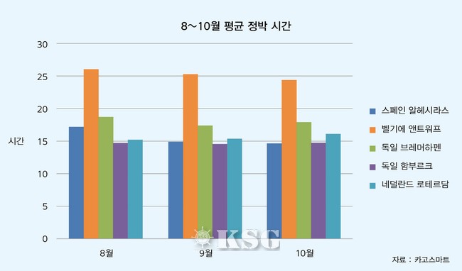 5대 항만의 입항지연은 9월부터 10월까지 두드러졌다. 성수기 화물수요에 힘입어 많은 선박들이 모여들었기 때문이다. 특히 네덜란드 로테르담항의 월평균 지연시간은 8월 17.8시간에서 10월 22.2시간까지 급증해 가장 오랜 시간이 걸렸다. 반면 함부르크항은 월평균 입항지연시간이 13.7~17.6시간에 불과해 비교 대상 항만 중 최단시간을 기록했다.