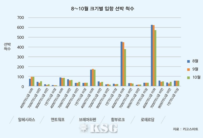 선박 입항이 가장 많은 항만은 로테르담항으로 타항만 대비 최소 200척 이상의 선박이 더 입항했다. 매일 25척의 선박이 오가는 로테르담항은 8월 770척, 9월 746척, 10월 715척의 선박이 입항을 신고했다. 입항 선박의 약 70%는 4000TEU급에 못 미치는 파나막스급 선박이었다. 뒤이어 함부르크항이 8월 532척, 9월 531척, 10월 456척이 입항해 로테르담항의 뒤를 이었다. 주요 입항 선박은 4000TEU급 미만의 선박들이었다.