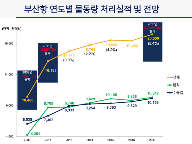 2004년 부산항만공사 창립 당시 1150만TEU에서 불과 13여년 만에 이룬 쾌거로, 세계의 공장이라 일컬어지는 중국 주요항만을 제외하고는 가장 높은 증가 속도다.