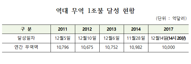 관세청과 산업통상자원부는 14일 오후 2시20분을 기해 올해 무역액 누계실적이 1조달러를 돌파한 것으로 잠정 집계됐다고 밝혔다.