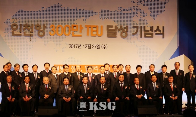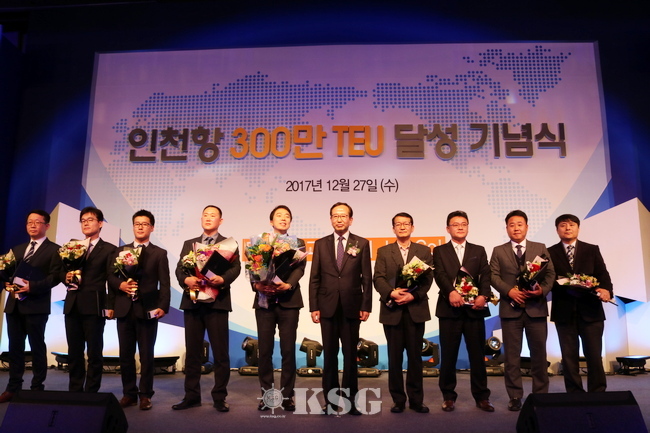 인천항은 개항 134년만에 연간 컨테이너 물동량 300만TEU(20피트 컨테이너)의 벽을 넘어서며 지난해 기준 세계 47위 항만으로 우뚝 서게 됐다. 인천항만공사(IPA)는 27일 인천 쉐라톤 그랜드호텔에서 해운항만물류업계 관계자 약 150명을 초청해 ‘인천항 300만TEU 달성 기념식’을 개최했다.