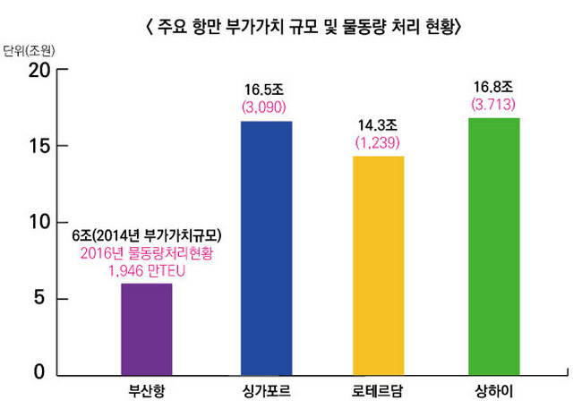 부산항은 지난해 한진해운 파산이라는 큰 파도를 겪었음에도 1978년 우리나라 최초의 컨테이너 전용 터미널인 자성대부두가 문을 연 지 39년만에 세계 6번째로 기념비적인 기록을 달성했다. 부산항 외에 물동량 2000만TEU를 돌파한 항만은 세계 1위 항만인 중국 상하이를 비롯해 싱가포르 선전 닝보·저우산 홍콩뿐이다. 부산항을 바짝 뒤쫓고 있는 중국 광저우항도 2017년에 2000만TEU를 달성할 것으로 점쳐진다.