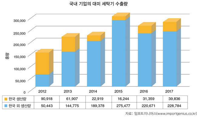 우리나라 기업들의 세탁기 수출은 2012년 14만t을 시작으로 2015년 29만t까지 2배 이상 증가했다가 최근 25만~27만t을 유지하고 있다. 국외 생산물량은 태국·베트남발 물량이 비약적으로 증가하면서 ‘메이드 인 차이나’ 대신 ‘메이드 인 사우스이스트아시아’로 급변하고 있다. 물류업계는 한국산 세탁기의 대 미국 수출량을 연간 약 260만대로 추정하고 있어, 세이프가드 발동에 따른 대미 물동량 충격을 크게 우려하고 있다.