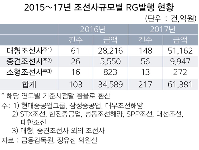 지난해 RG는 국내 대형조선사를 중심으로 신규 발급됐다. 17개 국책 및 시중은행이 발급한 RG는 217건 6조1381억원으로 2016년 대비 각각 110.7% 77.5% 증가한 것으로 나타났다. 조선업 시장이 2016년에 바닥친 뒤 지난해 세계 선박 발주량이 80% 급등하는 등 회복세를 보이면서 RG 발급도 증가한 것이다.