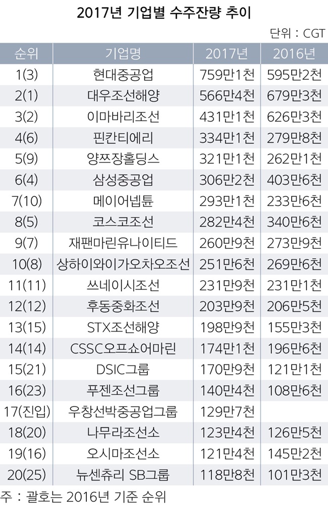 지난해 글로벌 조선사 수주잔량 부문에서 현대중공업은 일감 증가로 웃은 반면, 삼성중공업과 대우조선해양은 건조물량이 감소하며 울상을 지었다. 2017년 12월 말 전 세계 20대 조선사 중에서 1년 전과 비교해 일감이 늘어난 곳은 절반에 달했다. 단 1곳만이 수주잔량 증가를 기록했던 2016년과 비교하면 꽤 많은 조선소들의 일감이 늘어난 것으로 파악됐다.