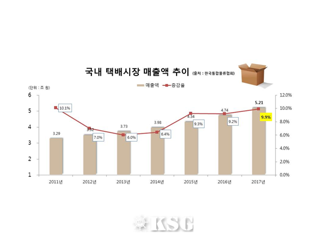 택배시장 매출액 규모는 2001년 6000억원에서 2017년 5조원으로 약 8배 성장했다. 택배회사 수는 2000년대 초반 60여개 기업에서, 현재는 중대형 16개사로 감소했다.
