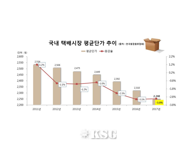 27일 한국통합물류협회에 따르면 지난해 국내 택배 물량은 전자상거래시장의 성장과 유통업체의 온라인판매 비중 증가에 따라 전년 대비 13.3% 성장한 총 23억1900만개를 달성했다. 매출액은 5조2146억원으로 전년 대비 9.9% 성장했다. 하지만 택배 평균단가는 전년 대비 3% 감소한 2248원으로 역대 최저치를 기록했다.
