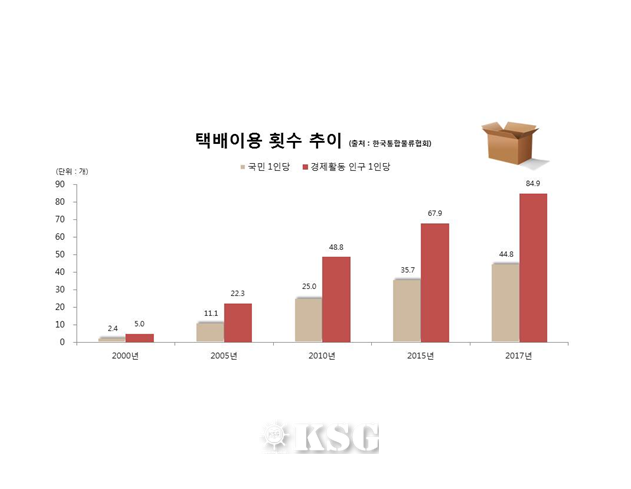 국민 1인당 택배 이용횟수는 연 44.8회, 국내 경제활동인구 1인당 이용횟수는 연 84.9회로 집계됐다. 2016년 통계에선 국민 1인당 39.6회, 국내 경제활동인구 당 75.7회보다 각각 5.2회, 9.2회로 집계된 바 있다. 국민 1인당 연간 택배이용횟수는 2000년 2.4회에서 2017년 44.8회로 18배 증가해 국민들의 보편적인 편의 서비스로 자리매김했다.