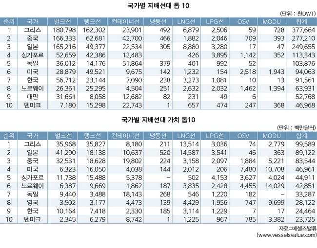 선대가치 기준으로 보면 우리나라는 세계 9위를 차지했다. 우리나라 지배선대의 총 평가가치는 244억6400만달러로, 지난해 6월에 견줘 덴마크를 제치고 순위 상승을 일궜다. 그리스가 995억8900만달러로 부동의 1위를 차지했고 일본이 891억2200만달러로, 835억4400만달러의 중국을 제치고 2위에 올랐다.