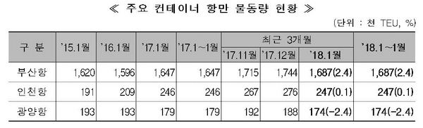 해양수산부에 따르면 전국 컨테이너 항만이 처리한 1월 컨테이너 물동량은 전년 동월 221만3000TEU(20피트 컨테이너) 대비 2.1% 증가한 225만8000TEU를 기록했다. 수출입물동량은 주요국 수출입 증가세의 영향으로 전년 동월 대비 4.5% 증가한 132만1000TEU를, 환적은 8.8% 증가한 90만6000TEU를 기록했다. 중국이 0.4% 감소한 데 반해 미국과 일본과의 교역은 각각 8.2% 9%씩 증가했다.