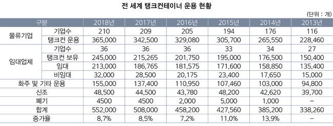 국제탱크컨테이너기구(ITCO)에 따르면 1월1일 현재 전 세계 탱크 컨테이너 개수는 1년 전에 비해 8.7% 증가한 55만2000개를 기록했다. 지난해 같은 날 집계치는 50만8000개였다.