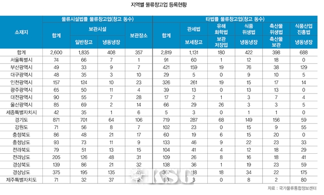 국가물류통합정보센터 지역별 물류창고업 등록현황에 따르면 2018년 3월22일 현재 물류시설법률에 따른 물류창고업수는 전국적으로 2600여개며, 타법률에 따른 물류창고업체수는 2819에 이른다. 지역별로는 경기도에 가장 많은 물류센터가 있으며 세종특별자치시가 가장 적게 분포돼 있다. 한편 물류센터가 군집돼 있는 물류단지는 전국적으로 총 30여개가 있다. 그 중 경인아라뱃길인천 물류단지가 114만5026㎡의 규모로 가장 크다.